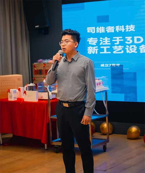 年會伊始,司維者科技集團總經理郭志文發表了熱情洋溢的總結演講。他回顧了公司七年來的發展歷程,強調了司維者科技集團始終堅持創新驅動,深耕3D打印及相關領域,不斷拓展市場版圖。郭總表示,未來,司維者將繼續加大研發投入,深化與各事業部的協同合作,致力于為客戶提供更加先進、高效的產品和服務。